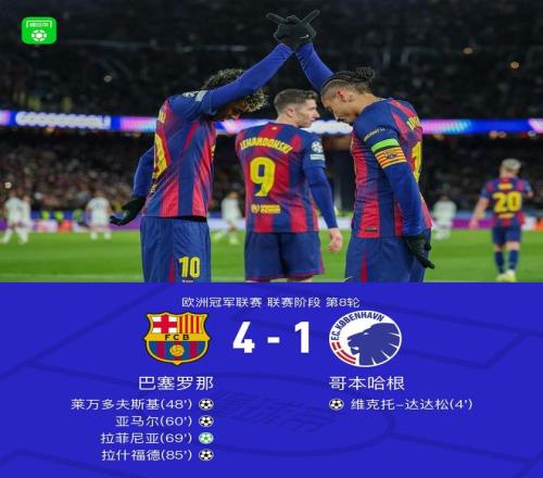 北京时间1月29日欧洲冠军联赛 联赛阶段 第8轮,巴塞罗那对阵哥本哈根。上半场,达达松单刀破门。下半场,亚马尔助攻,莱万破门。随后,亚马尔射门折射入网。莱万造点,拉菲尼亚主罚命中,替补登场的拉什福德任意球直接得分。全场比赛结束,巴萨4-1逆转哥本哈根直接晋级。